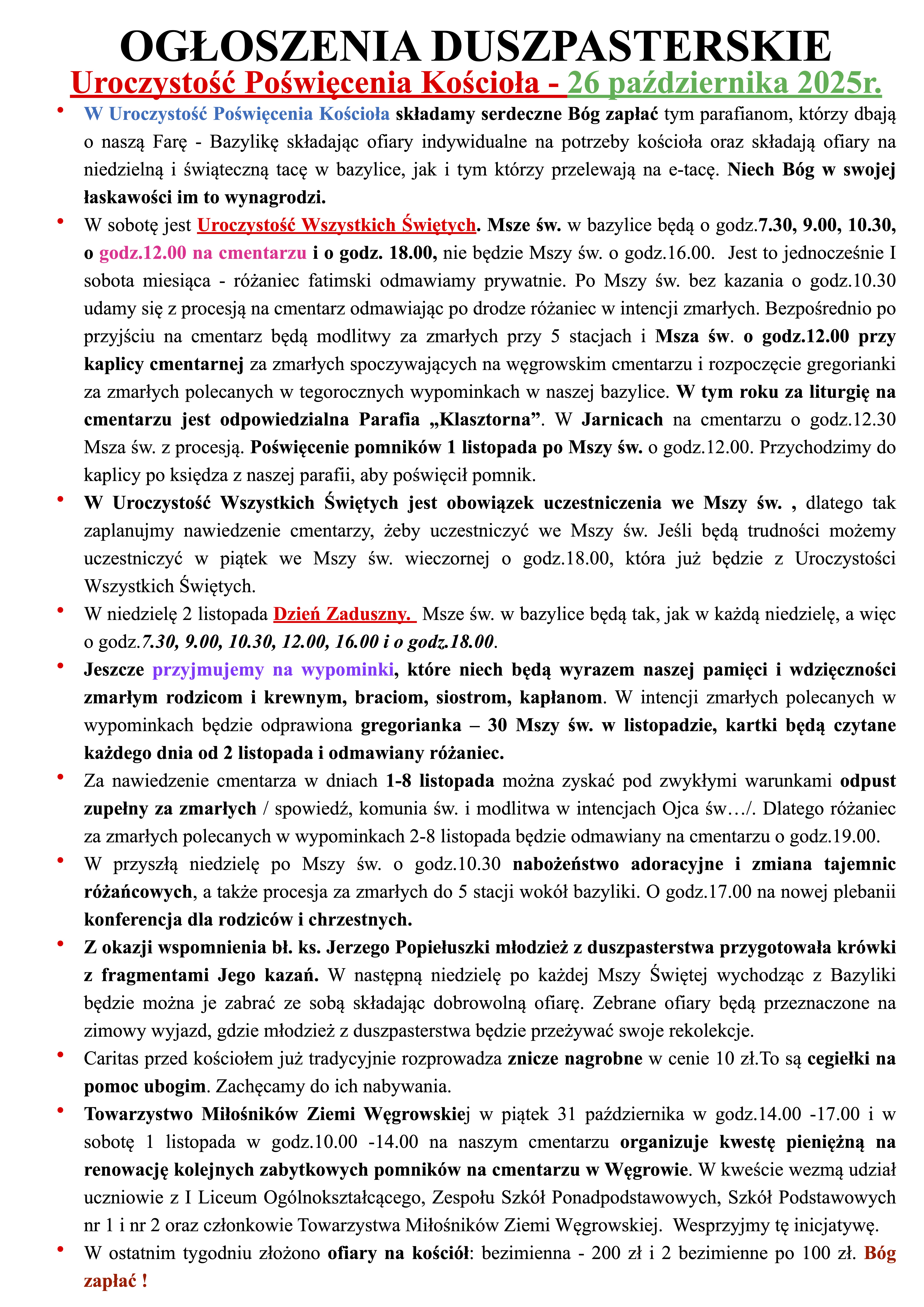 INTENCJE MSZALNE 27.10. – 02.11.2025r.