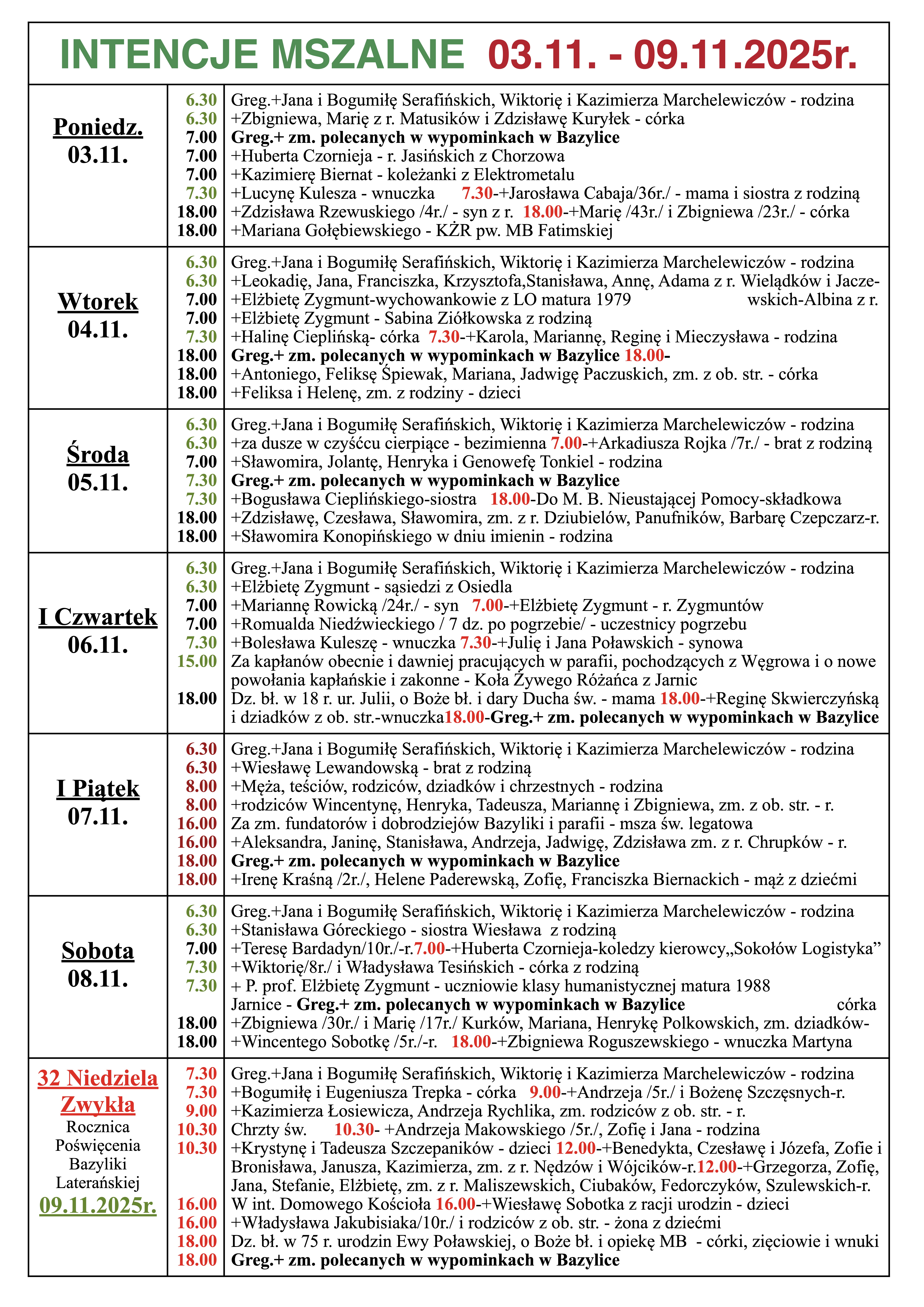 INTENCJE MSZALNE 03.11. – 09.11.2025r.
