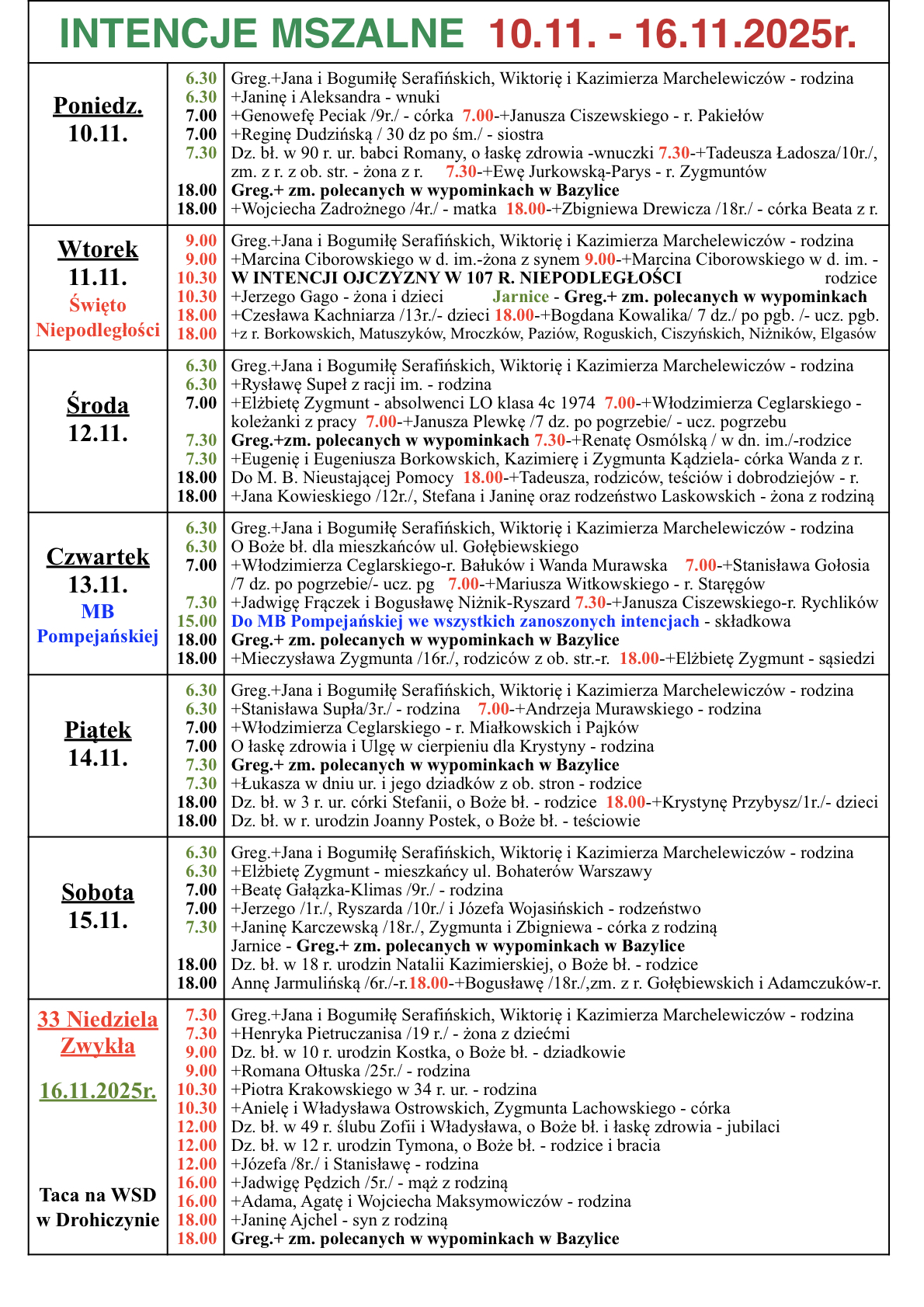 INTENCJE MSZALNE 10.11. – 16.11.2025 r.