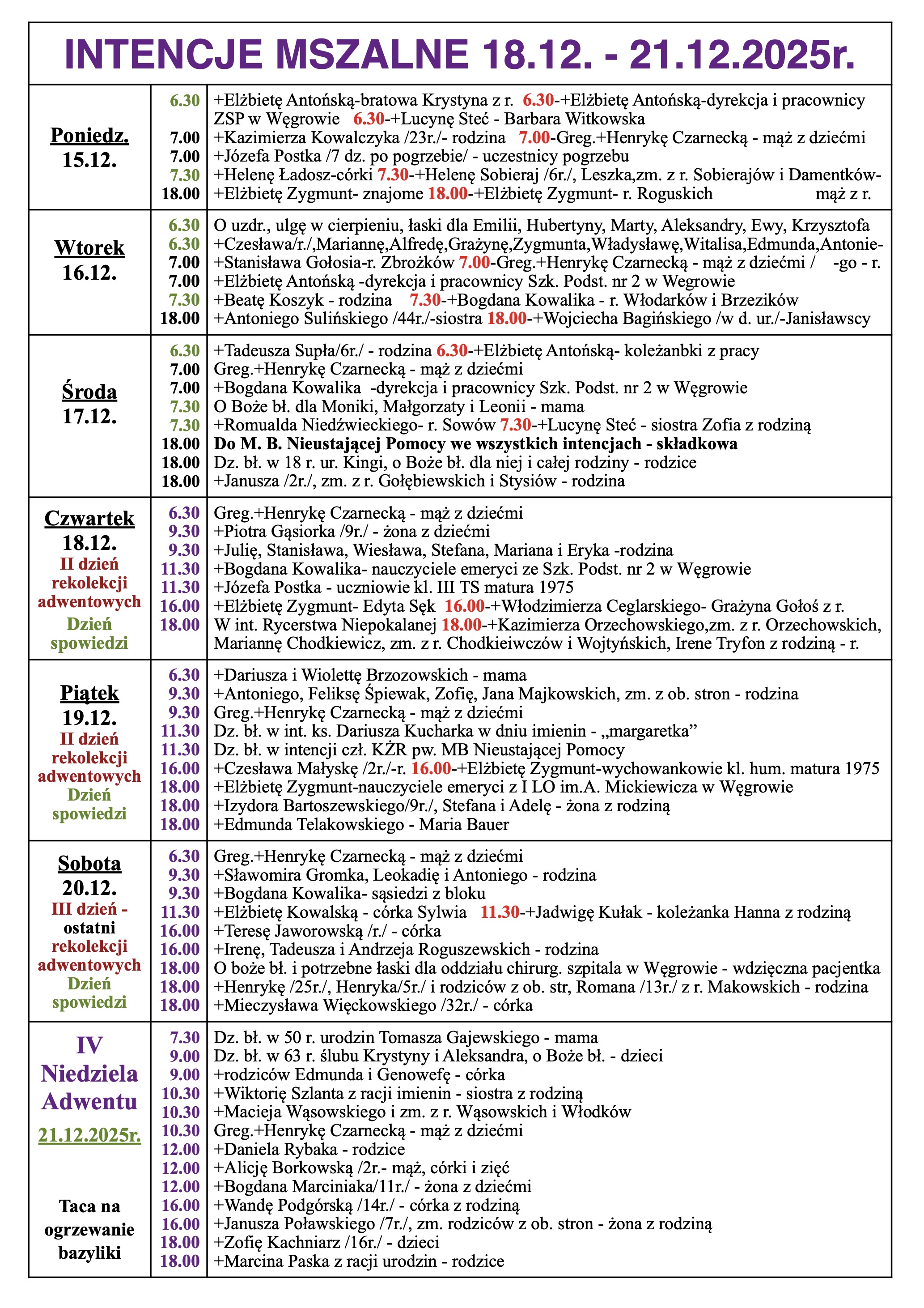 INTENCJE MSZALNE 18.12. – 21.12.2025r.