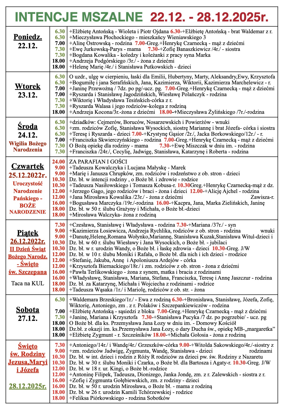 INTENCJE MSZALNE 22.12. – 28.12.2025r.