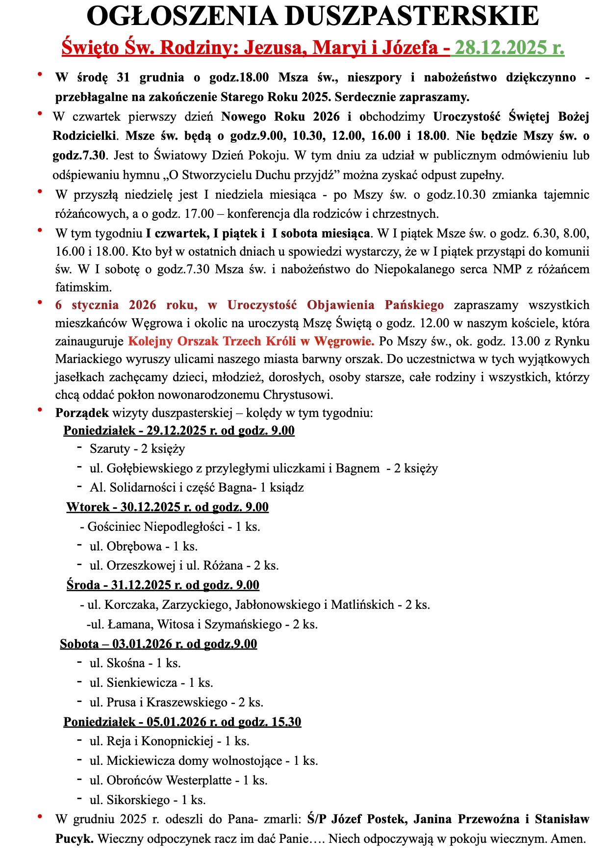 INTENCJE MSZALNE 29.12. – 04.01.2026r.