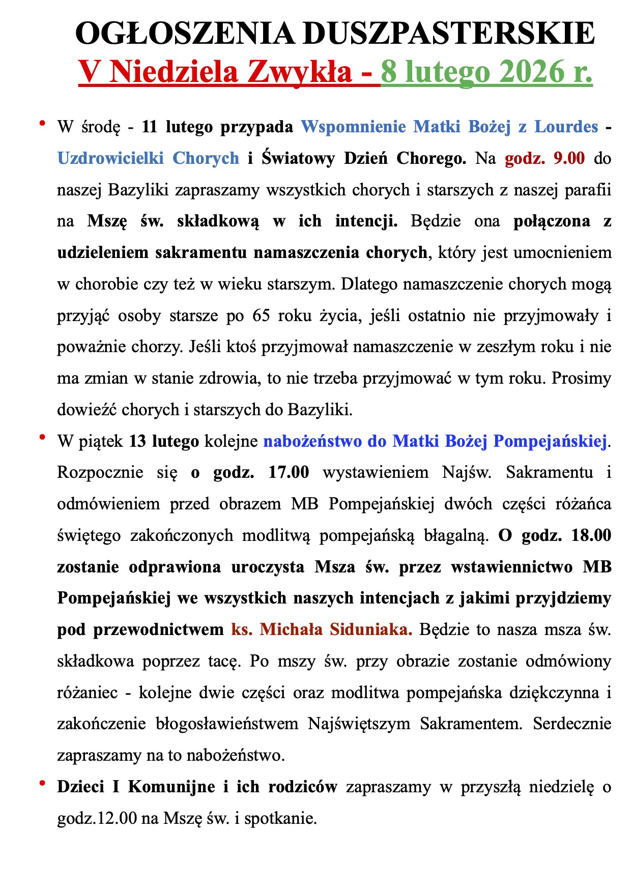 INTENCJE MSZALNE 09.02. – 15.02.2026r.