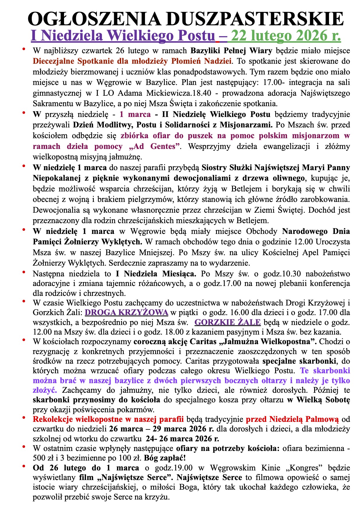 I Niedziela Wielkiego Postu – 22 lutego 2026 r.