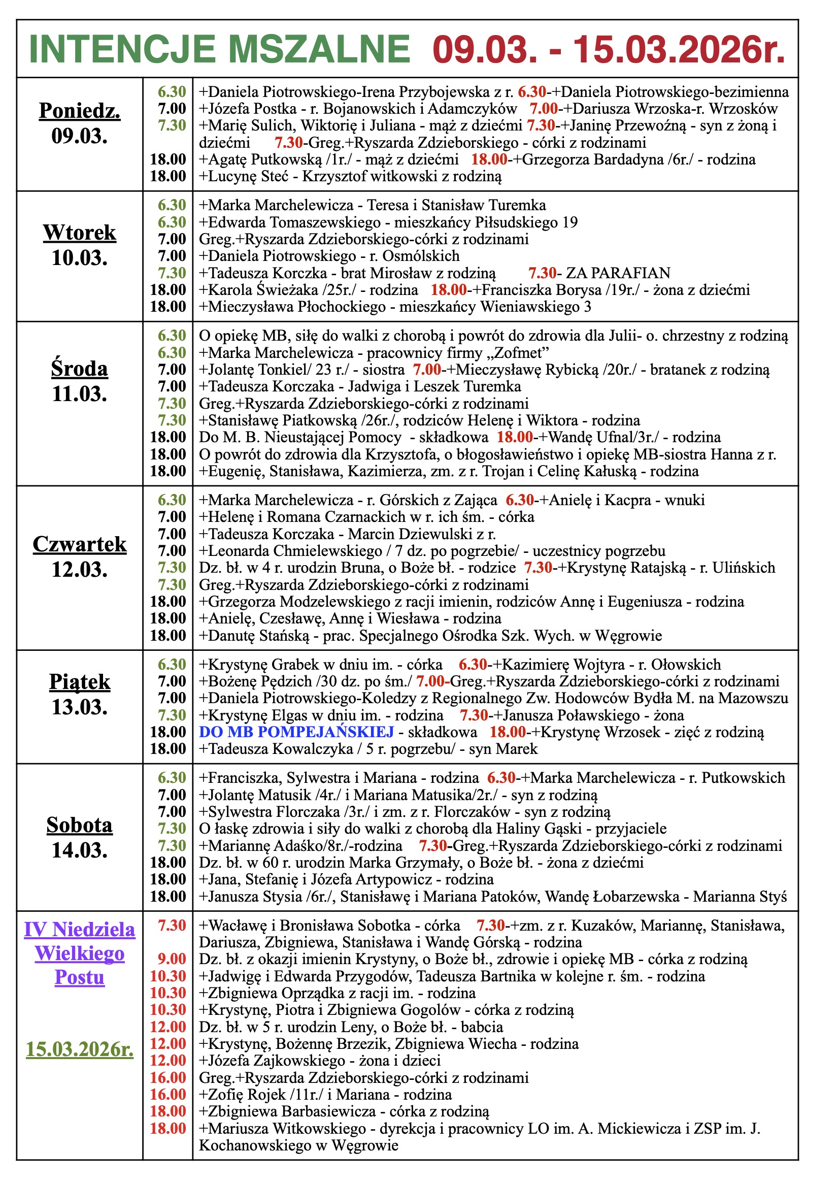 INTENCJE MSZALNE 09.03. – 15.03.2026r.