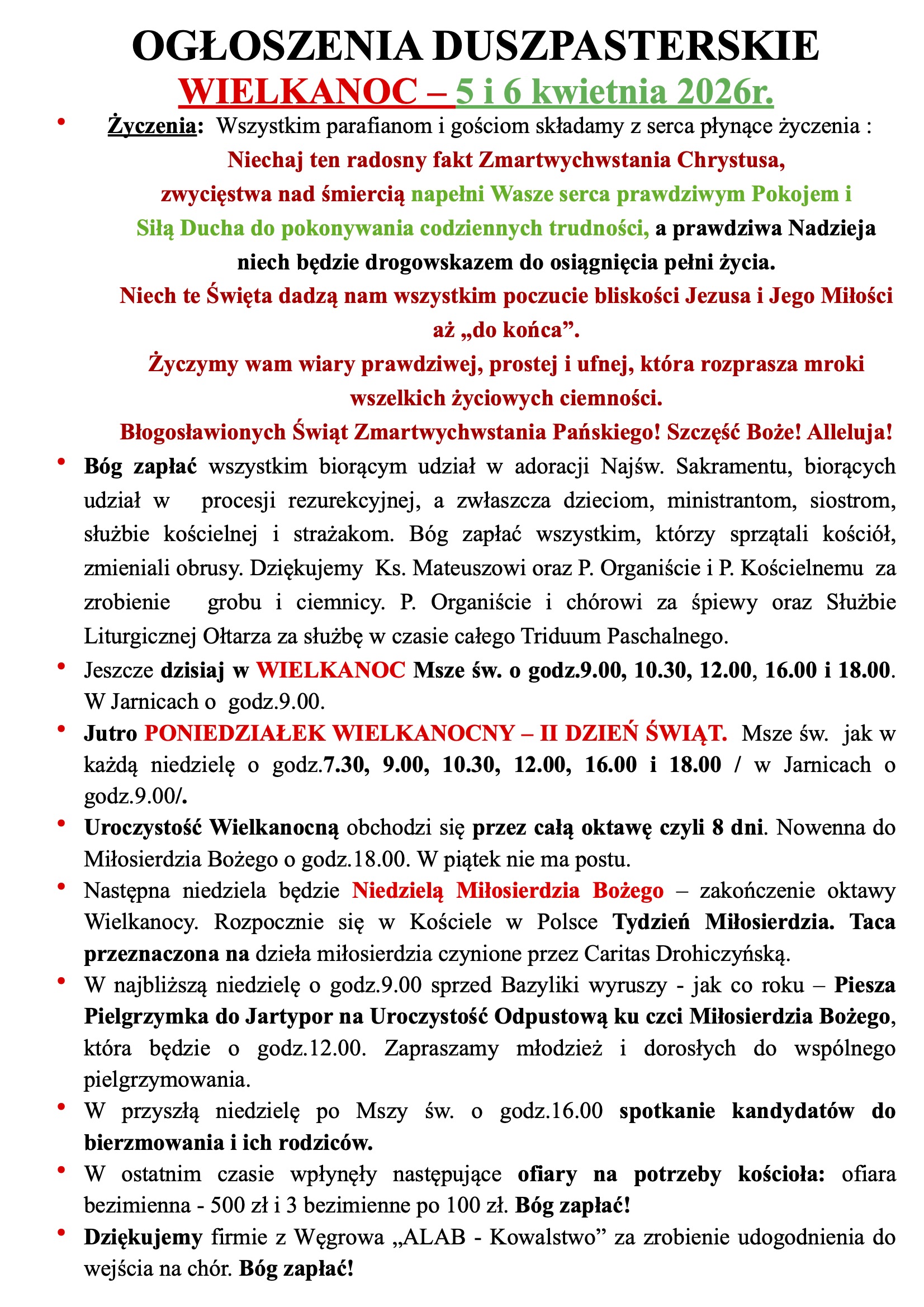 WIELKANOC – 5 i 6 kwietnia 2026r. – Życzenia i ogłoszenia