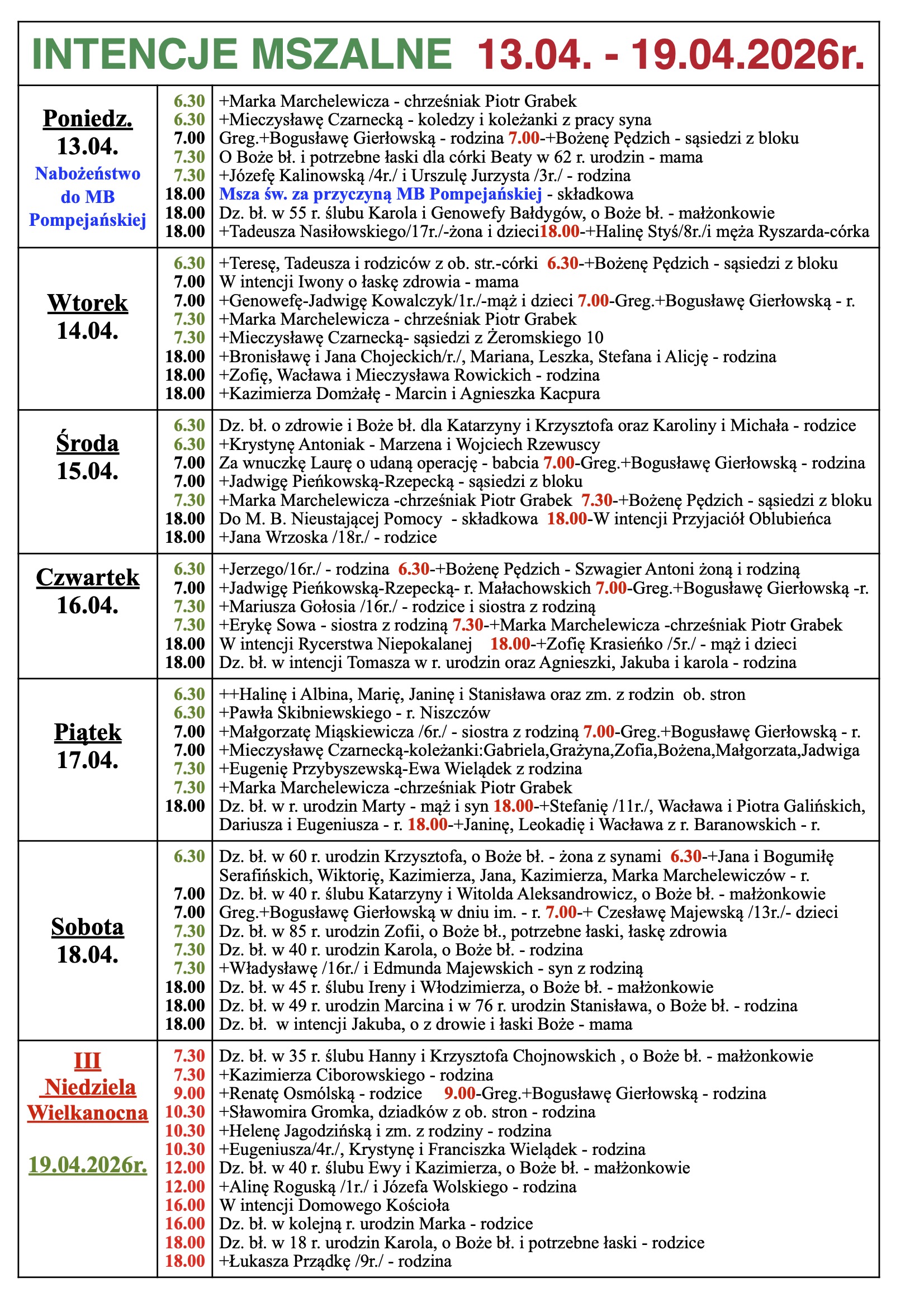 INTENCJE MSZALNE 13.04. – 19.04.2026r.
