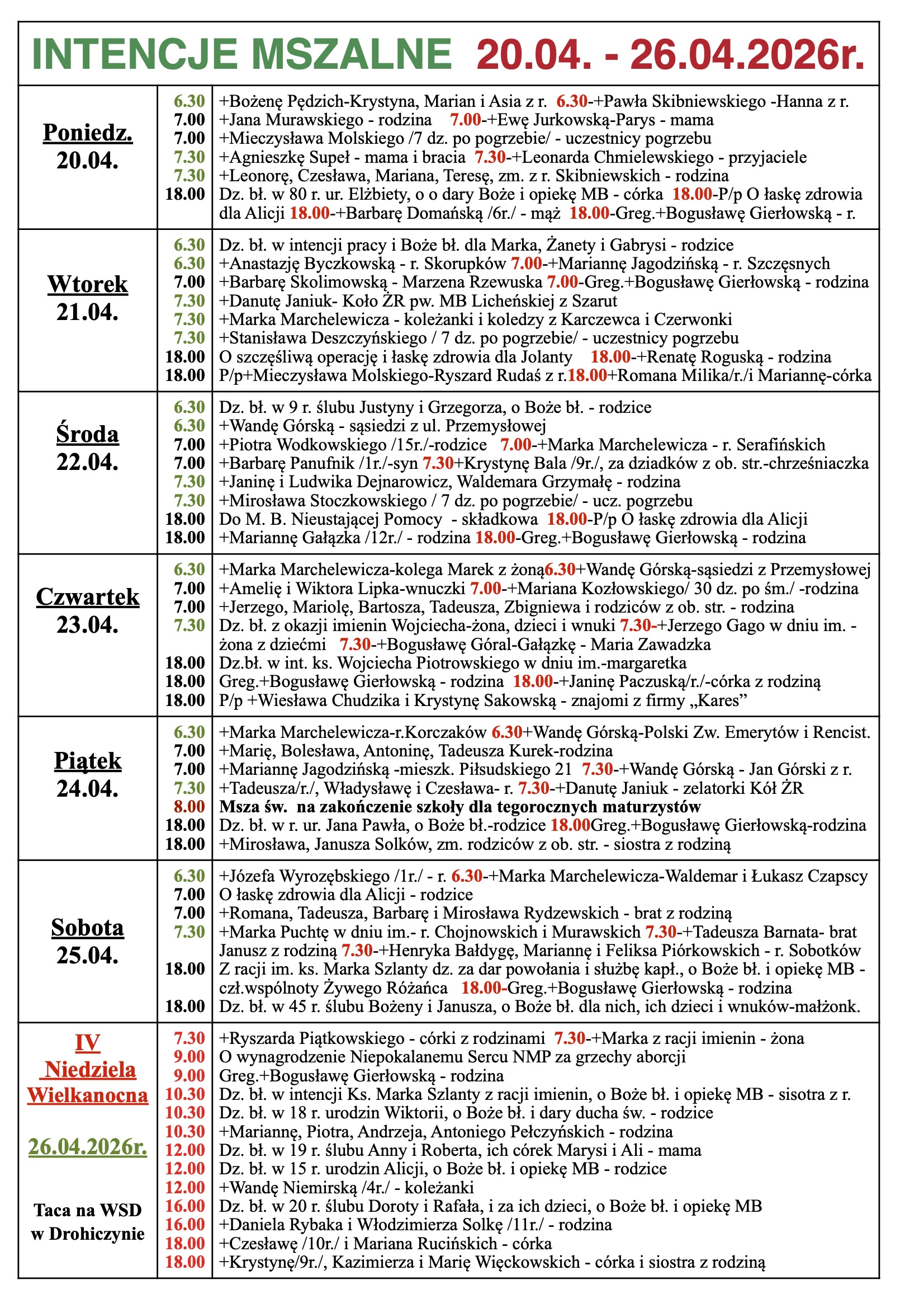 INTENCJE MSZALNE 20.04. – 26.04.2026r.
